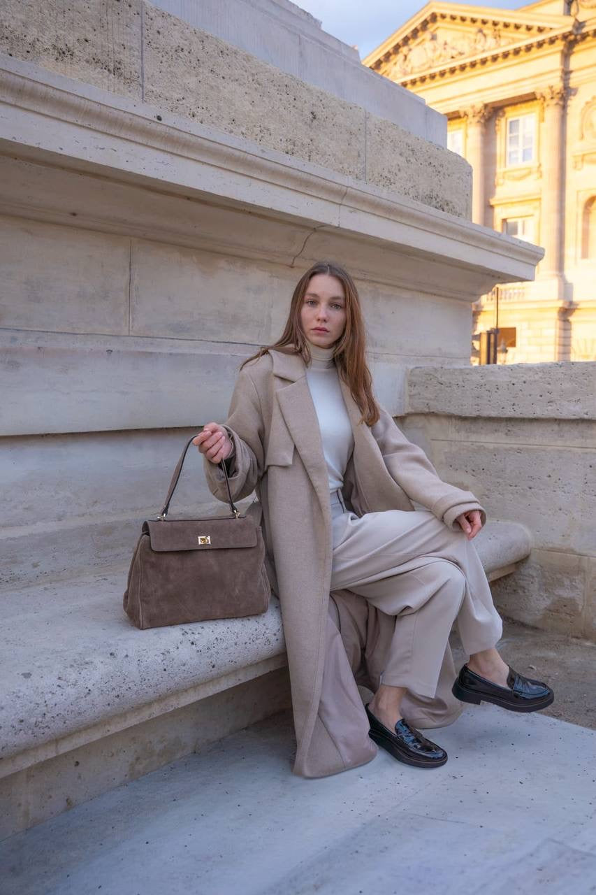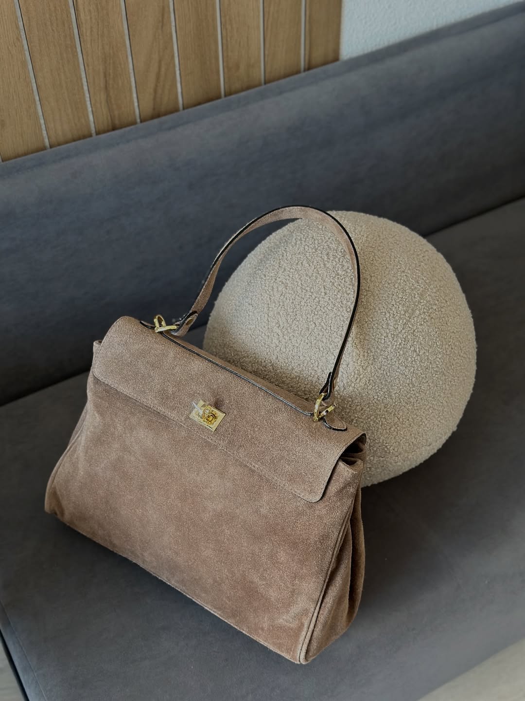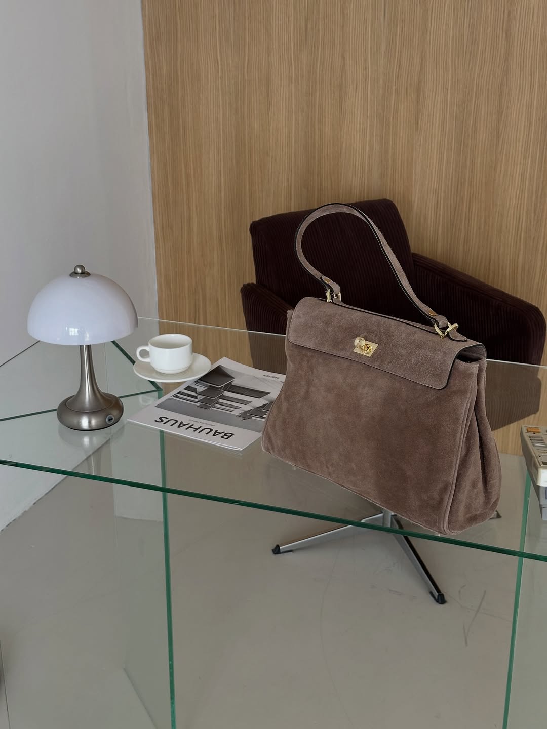 Céleste exudes soft luxury, crafted from suede in a deep burgundy tone that gives it warmth and refined character. The classic flap design, complemented by a gold-tone metal clasp, creates a timeless look with a subtle vintage touch. Its gently structured silhouette maintains its shape, while the soft texture adds femininity and sophistication.
